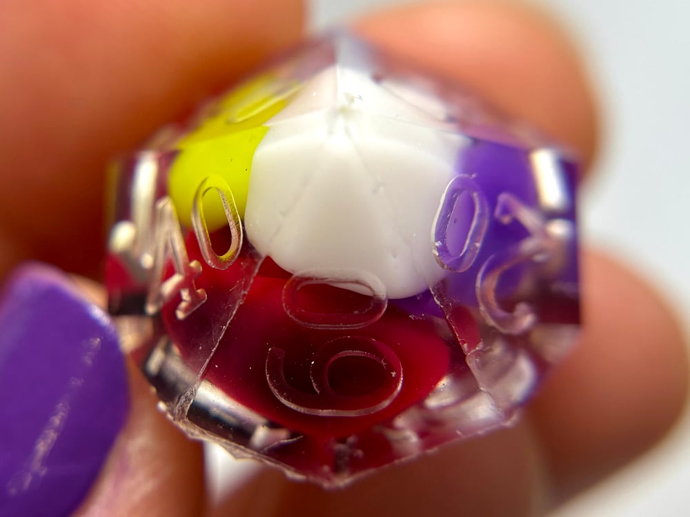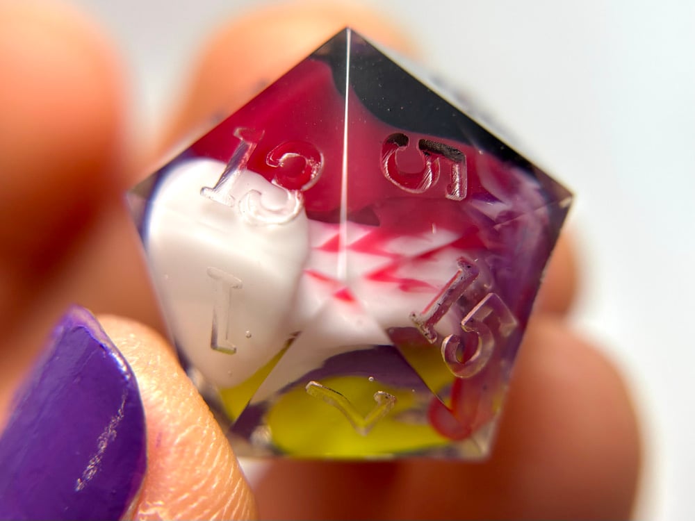 This dice set is hand made by me which means they will have small imperfections, rough edges, scuffs, paint flaws and maybe even bubbles. But that’s how you know it’s made by hand with love and dedication! Each set is made with high quality glitters, resins and pigments.