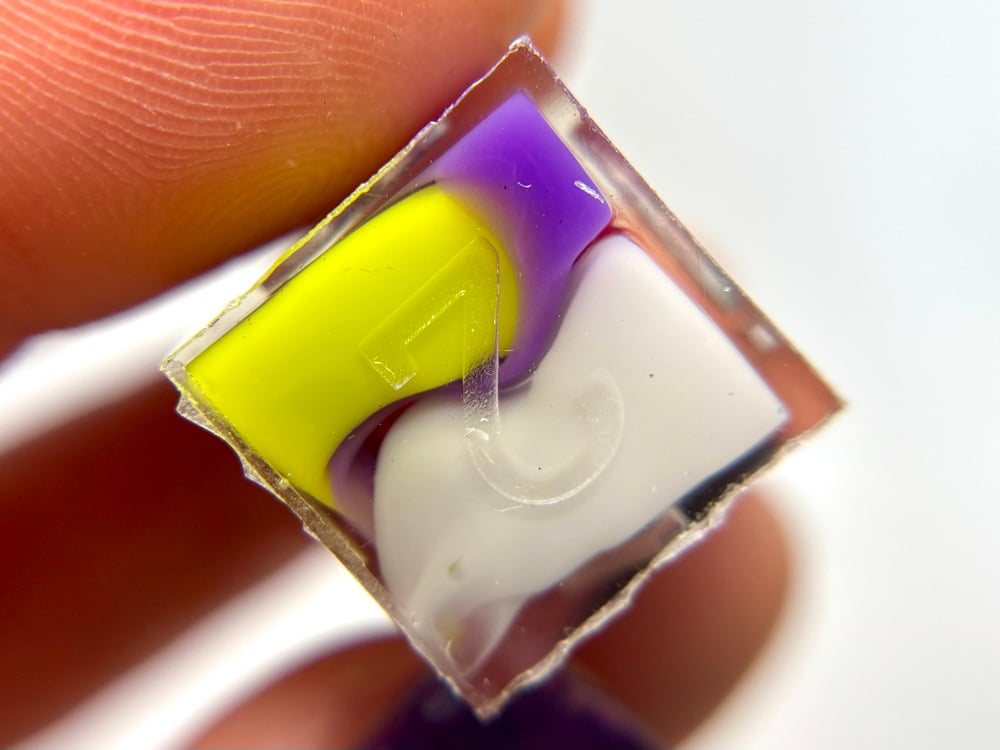 This set features injected blobs of chartreuse, purple, white, red and black.