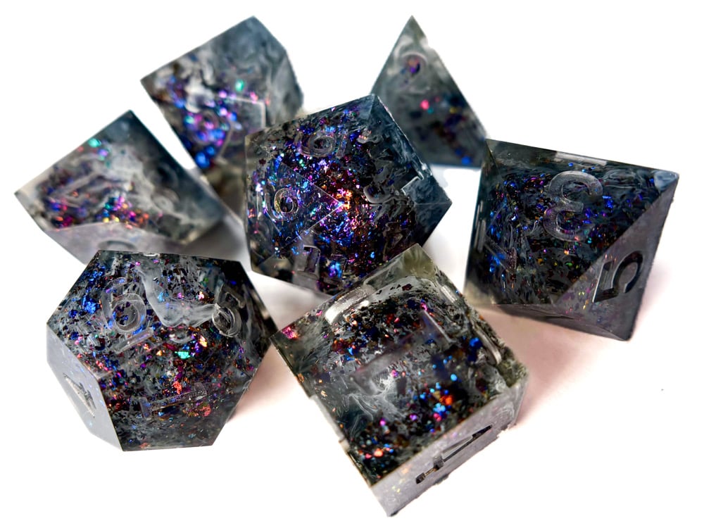 This dice set is hand made by me which means they will have small imperfections, rough edges, scuffs, paint flaws and maybe even bubbles. But that's how you know it's made by hand with love and dedication! Each set is made with high quality glitters, resins and pigments.