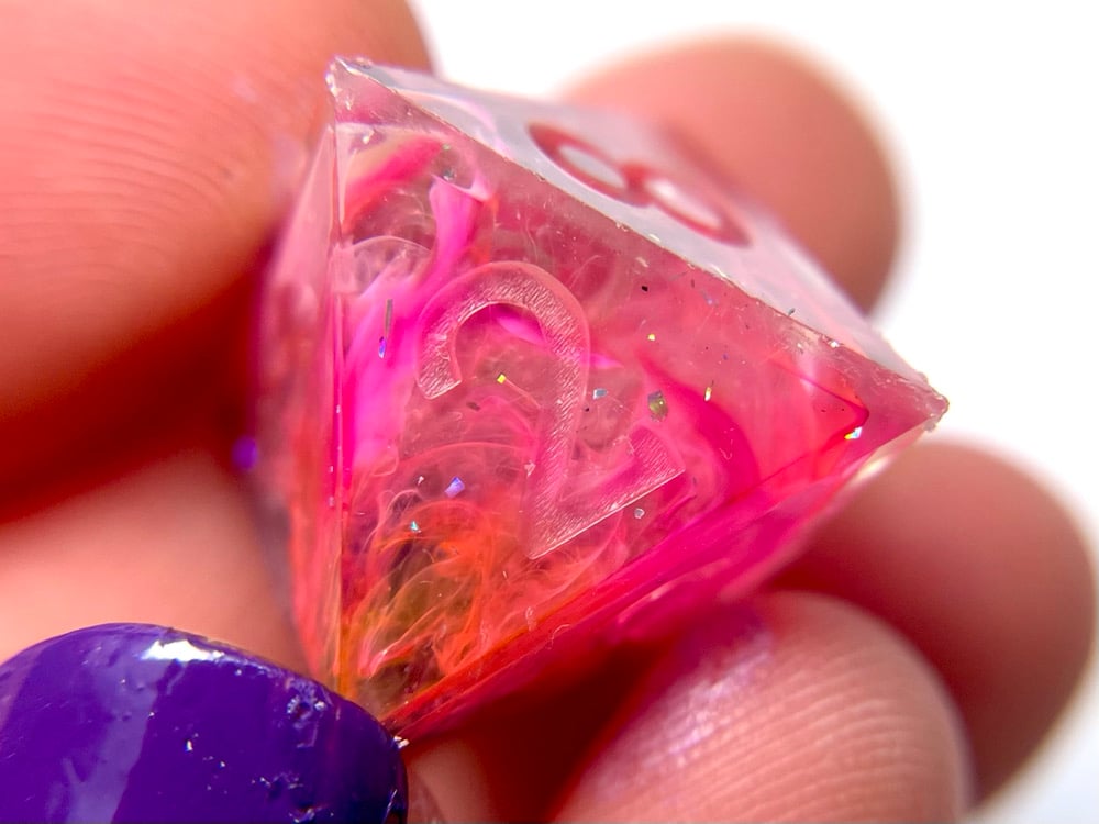 This slush pour had a mind of its own. Even though equal amounts of blue, yellow and magenta ink were used, the pink decided it wanted to be the star of the show. With the addition of some holo flakes in the final shell of the dice, this fun set of pink and sparkle came to life!
