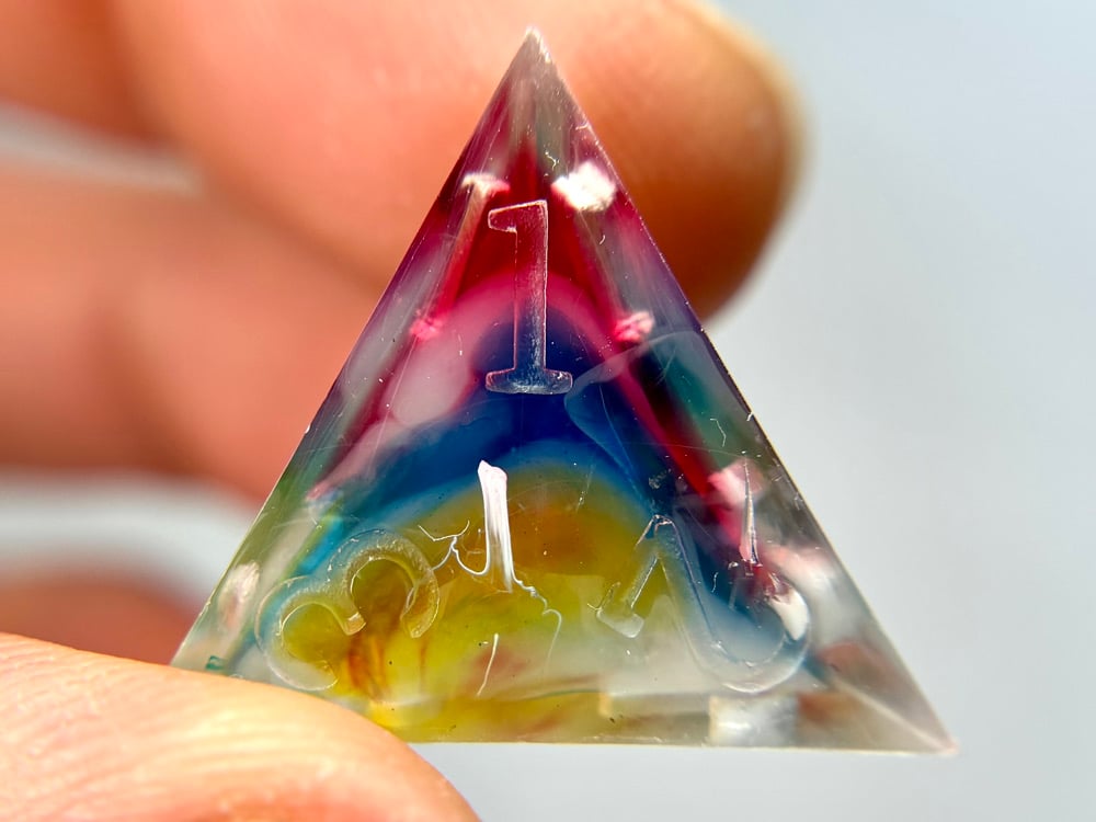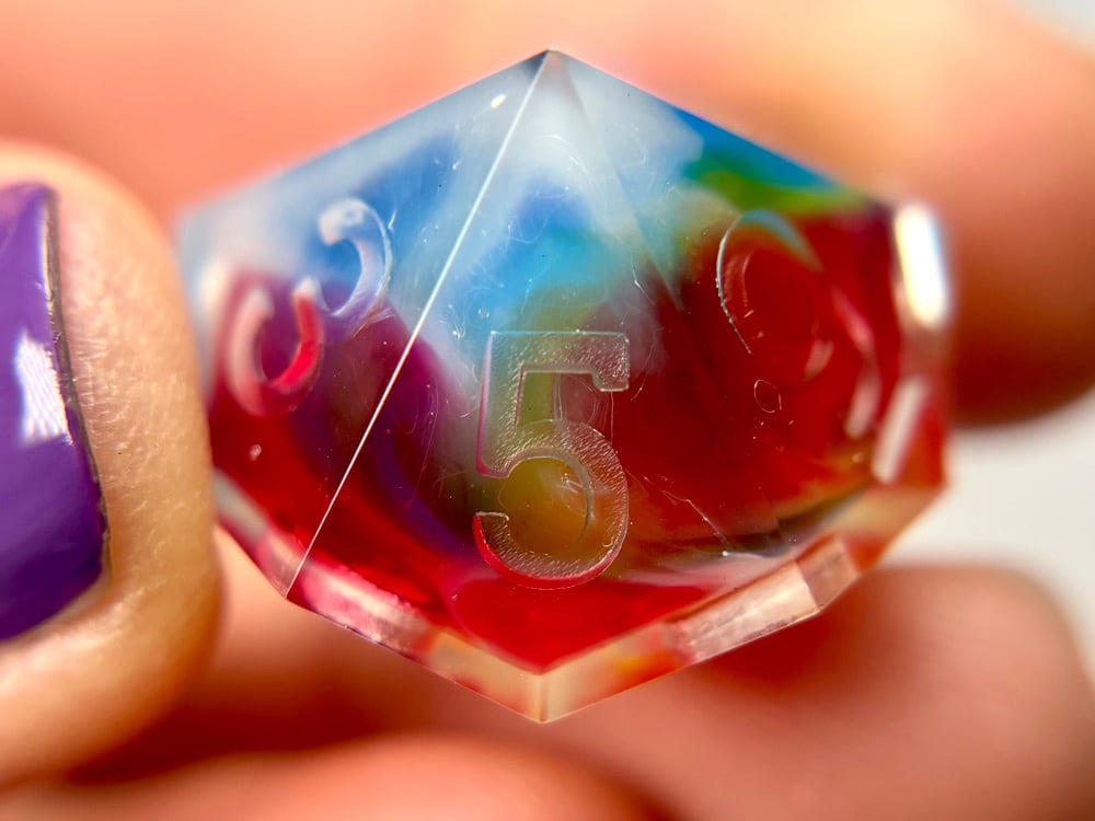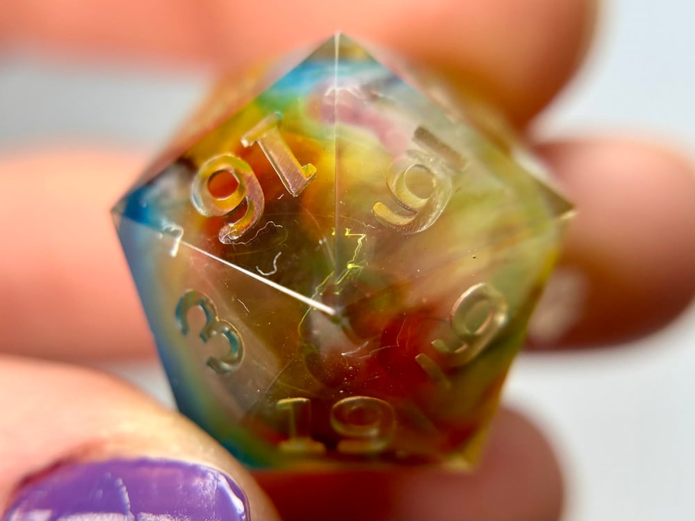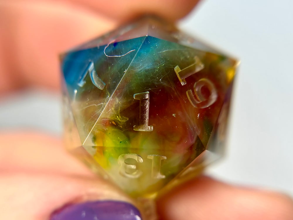 This set started as white and the primary colors and was transformed into a chaotic swirl of white and rainbow colors as the resin was put into the molds. The colors on the d20 are a bit muddled, but the rest of the set is perfection