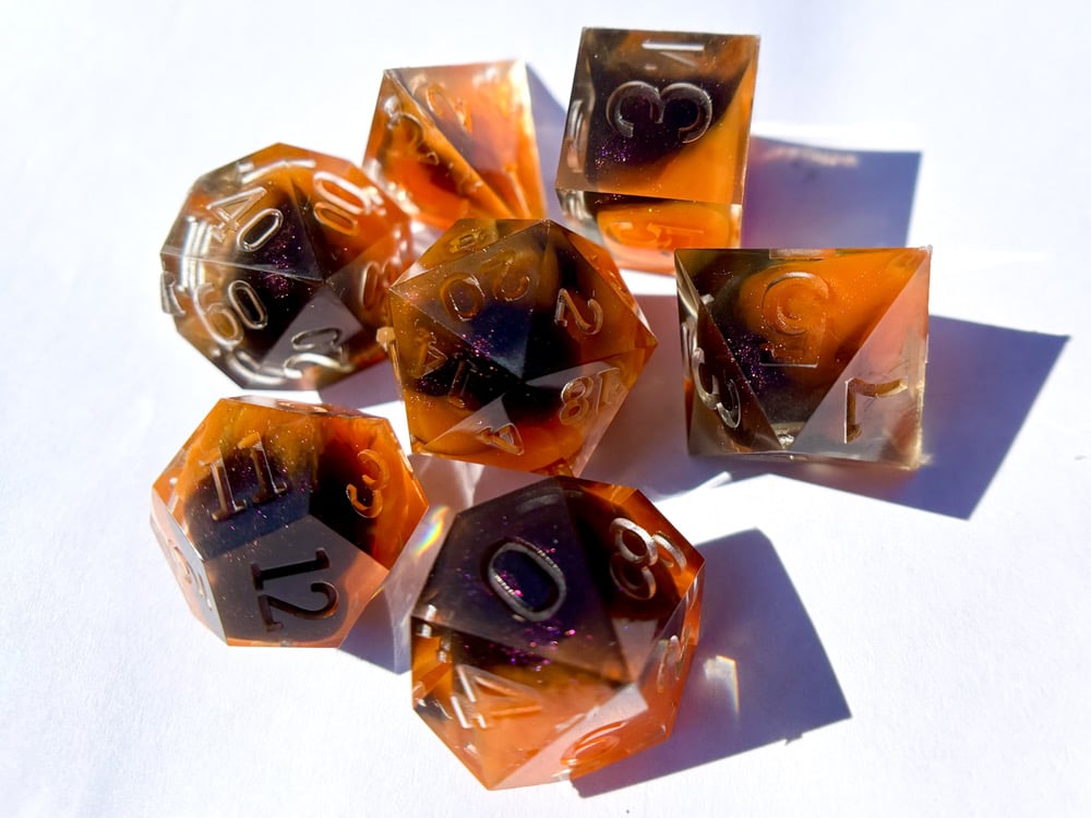 It’s almost spooky season! In celebration, this set of black and orange has a slight shimmer in each cloud, with the black cloud having a subtle purple shimmer. A perfect dice set for any Halloween one-shots or campaign