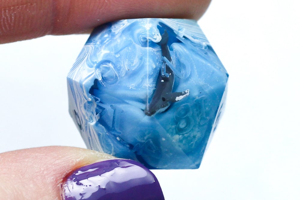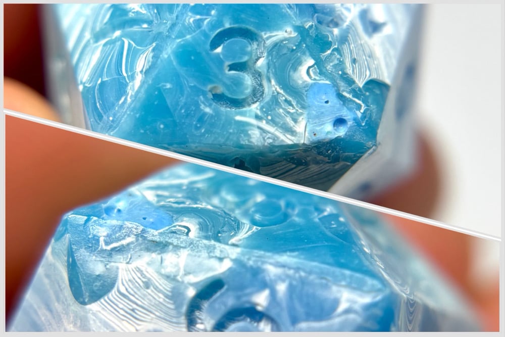 Quirks: the low faces of the molds are missing the striations of all of the other faces. On the d20, the corner of the 3 face has a repair where the color is mismatched. Additionally, the edges around the 3 on the d20 are rougher than my usual work, I decided to leave it like this rather than sand down the faces which would remove the white striations. You can see this in the light but not when glancing at the set