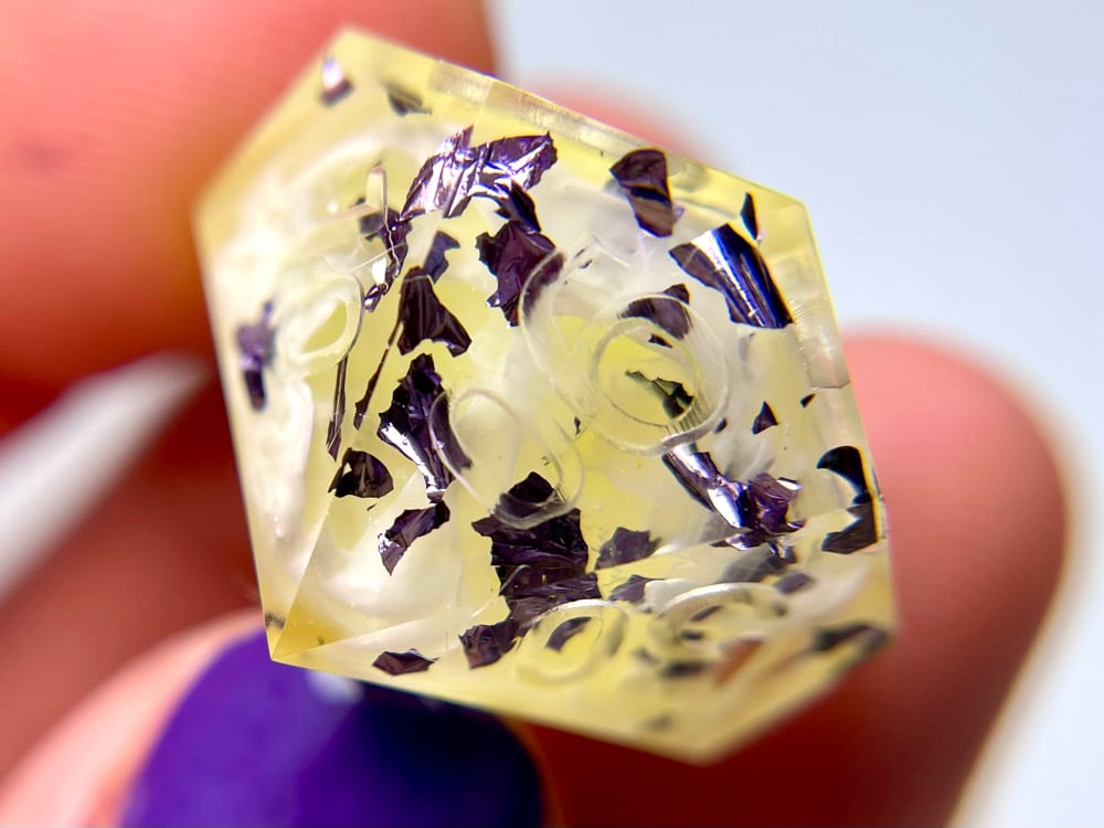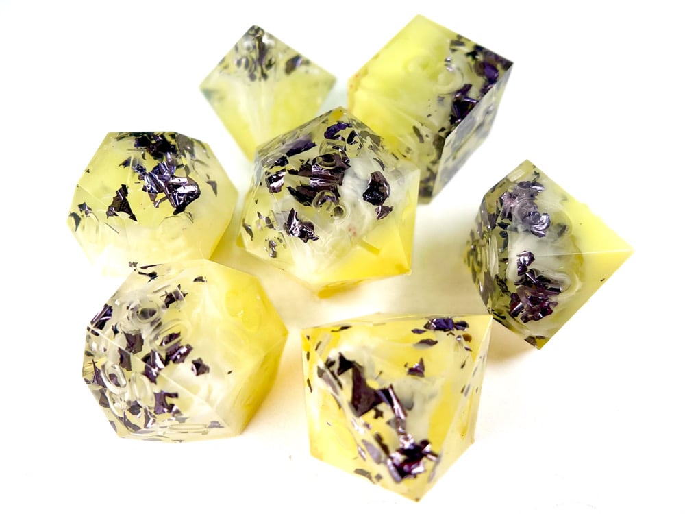This dice set is hand made by me which means they will have small imperfections, rough edges, scuffs, paint flaws and maybe even bubbles. But that's how you know it's made by hand with love and dedication! Each set is made with high quality glitters, resins and pigments.